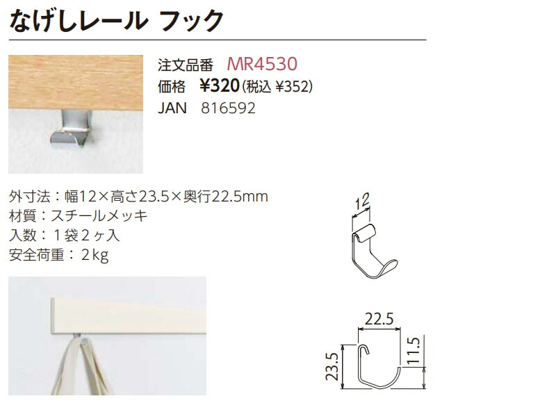 空いてる壁を収納に レールオプション なげしレール フック MR4530(1袋2ヶ入)