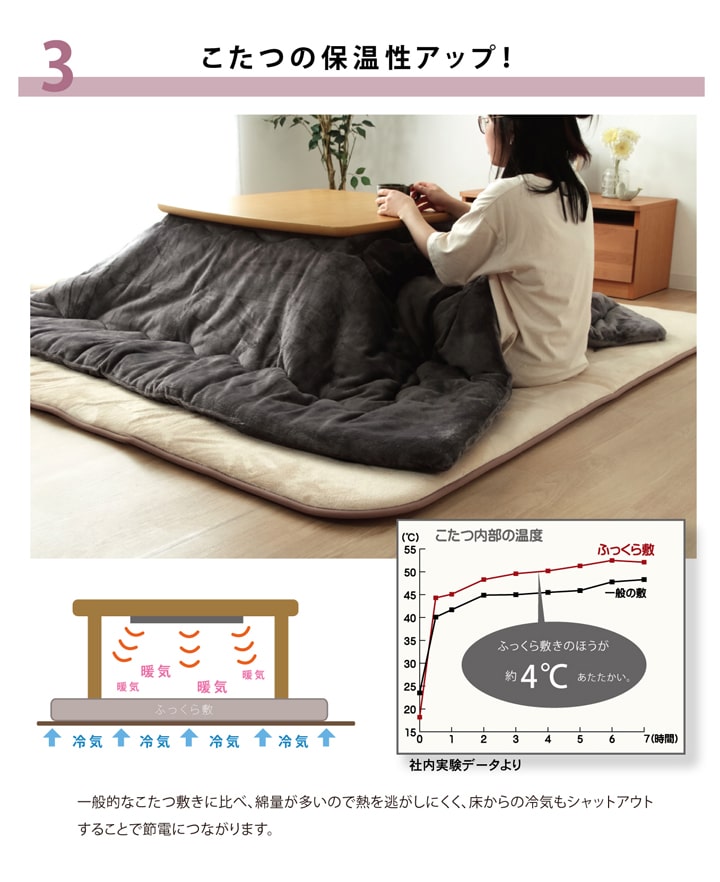 | 表地には肌触りが良く、耐久性に優れたマイクロファイバーを使用しています。中材にはクッション性にこだわった国産の固綿40mmを使用しています。十分な弾力性があるのでフローリングでのご使用にも最適です。遮音特級LL-30を取得しています。床下への騒音も軽減します。また、こたつと併用するとこたつの熱を床下へ逃しにくくなるので省エネ効果もあります。 |