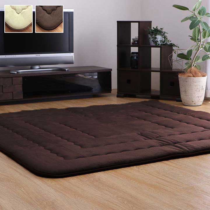 | 表地には肌触りが良く、耐久性に優れたマイクロファイバーを使用しています。中材にはクッション性にこだわった国産の固綿40mmを使用しています。十分な弾力性があるのでフローリングでのご使用にも最適です。遮音特級LL-30を取得しています。床下への騒音も軽減します。また、こたつと併用するとこたつの熱を床下へ逃しにくくなるので省エネ効果もあります。 |