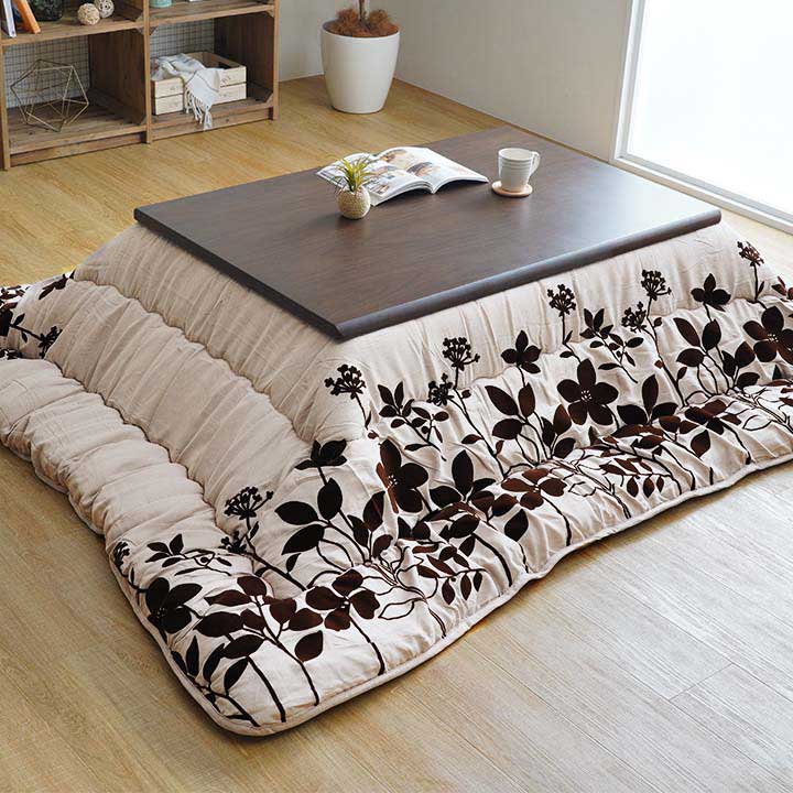 | シンプルなリーフ柄をあしらった商品です。表地には肌触りやわらかなフランネルを使用しました。部分暖房のこたつは電気代もお得です。 |