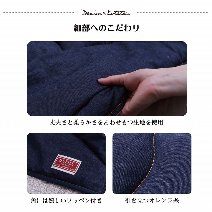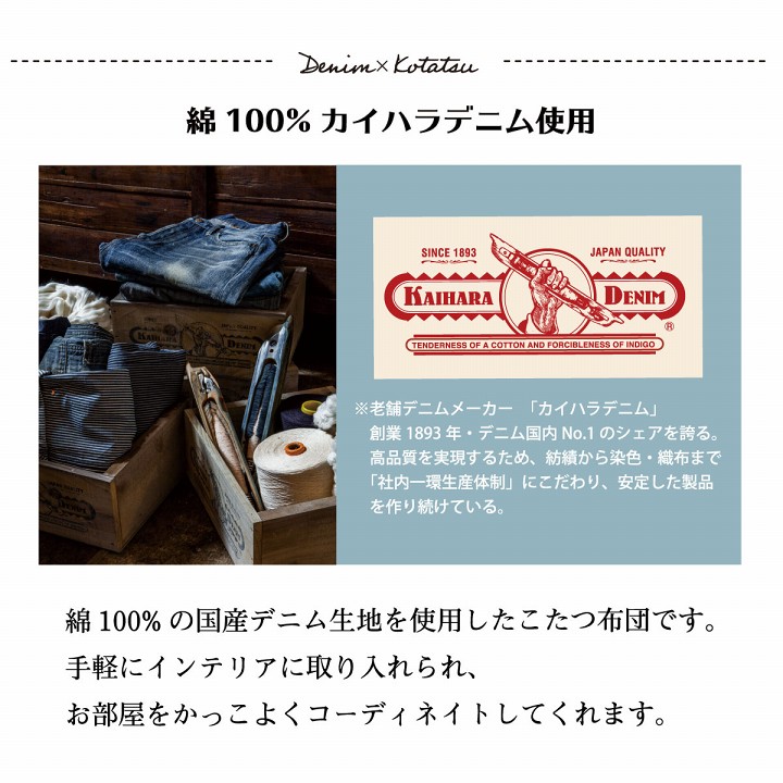 | イケヒコ×KAIHARAデニムコラボ企画。こだわりの国産デニムを使用したこたつ布団です。国産デニム生地綿100%だから安心で、しっかり丈夫な素材です。デニムの風合いを残しつつ、色落ちしにくい染め方やソフト仕上げ加工を施しています。裏地はなめらかな肌触りのフランネルを使用し、肌に触れる部分も暖かい仕上げです。部分暖房のこたつは電気代もおトクです。※ こたつ台、こたつ敷き布団は別売りです。※ 掲載写真は表記サイズと異なる場合がございます。※ ふとんをやぐらの中に押し込んだり、座イスやイス全体をこたつの中に入れたまま使用しないでください。ふとんがヒーターに当たらないようにご使用ください。(火災の原因になります)ご使用により、ふとんが焦げた場合につきましては、返品・交換を承ることができませんので、あらかじめご了承ください。 |