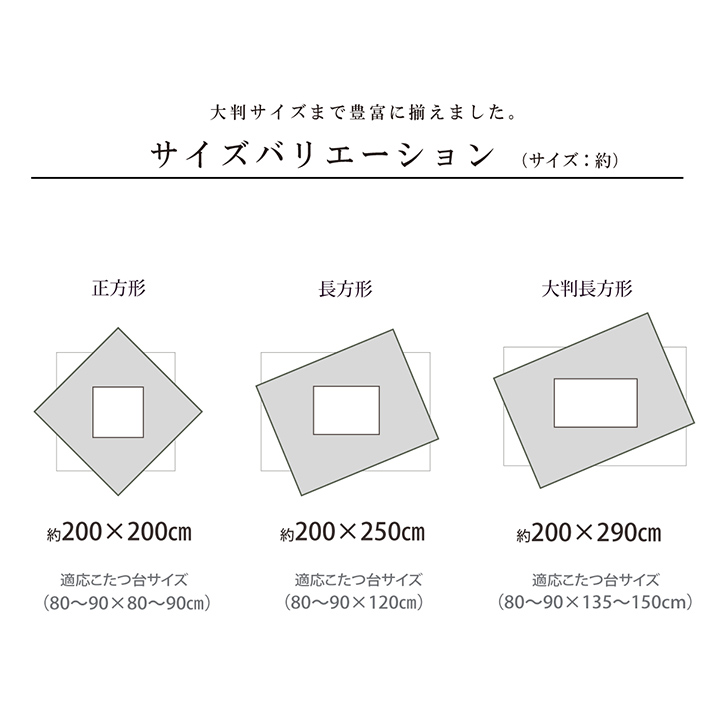 | 表地=ポリエステル100%裏地=ポリエステル100%中材=ポリエステル100% (200×200cm:1.3kg/ 200×250cm:1.7kg / 200×290cm :1.9kg) |