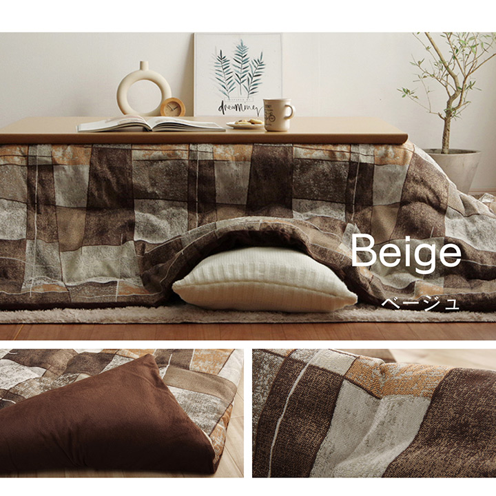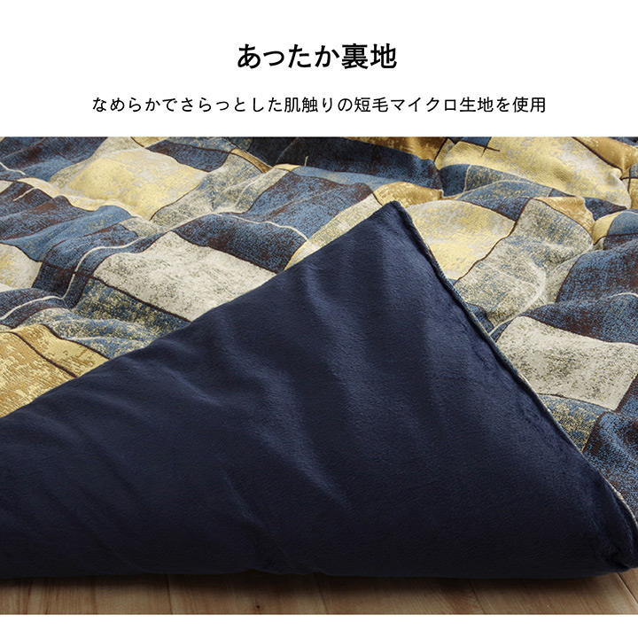 | ビンテージ風のパッチワークデザインが特徴のしっかりした生地を使ったこたつ布団。表地はシェニール織りの暖かみある凹凸感ある生地を使用し、裏地にはなめらかな肌触りの短毛マイクロ生地を使用しています。たっぷり入った東レマッシュロン綿がふかふかとした弾力性と保温性を高め、「軽くて暖かい」を実現しました。ふっくらとしたボリューム感は国内で綿入加工をしている商品だからできる仕上がり。1枚1枚丁寧に仕上げた安心の品質です。 |