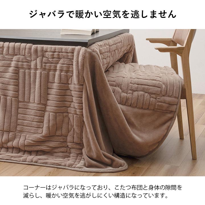 | ハイタイプのこたつ台に使えるこたつ布団です。普段のダイニングで過ごす団欒を、こたつの温もりを感じながら楽しめます。手触りなめらかなラビットファー調生地を使用しています。側面にはポケットが付いており、リモコンや小物を収納しておくことができます。天板を固定する金具通しの穴付きなので、天板と布団のズレを軽減してくれます。コーナーはジャバラになっており、こたつ布団と身体の隙間を減らし、暖かい空気を逃がしにくい構造です。洗濯機での丸洗いが可能です。 |