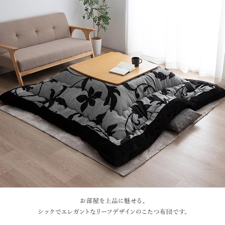 | お部屋を上品に魅せる、シックでエレガントなリーフデザインのこたつ布団です。表地は凹凸感のあるシェニール織の生地を使用し、暖かみのある肌触りが特徴です。裏地はフランネル生地で暖かいです。国内で綿入れ加工をしているので、ふっくらとしたボリューム感のある仕上がりです。環境にやさしいマッシュロンの中綿を使用しています。軽量ですがボリューム感のある保温性の高い綿になります。 |