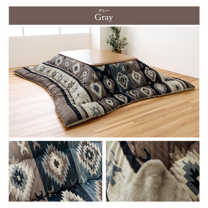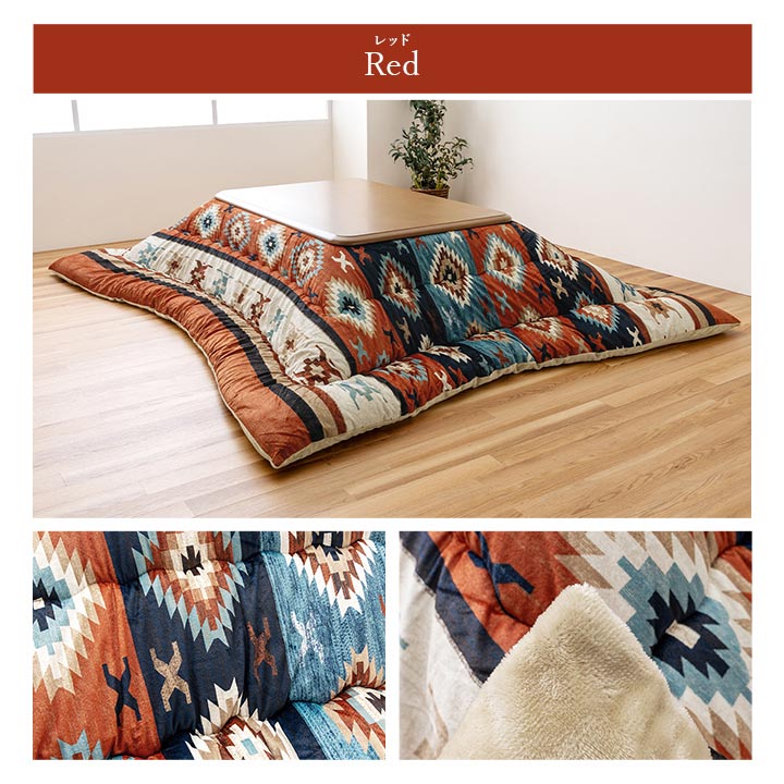 | 華やかなデザインのキリム柄のこたつ布団です。表地には肌触りの良い短毛マイクロファイバーを使用し、ふかふかの触り心地です。裏地はフランネル生地で暖かいです。国内で綿入れ加工をしているので、ふっくらとしたボリューム感のある仕上がりです。環境にやさしいマッシュロンの中綿を使用しています。軽量ですがボリューム感のある保温性の高い綿になります。 |