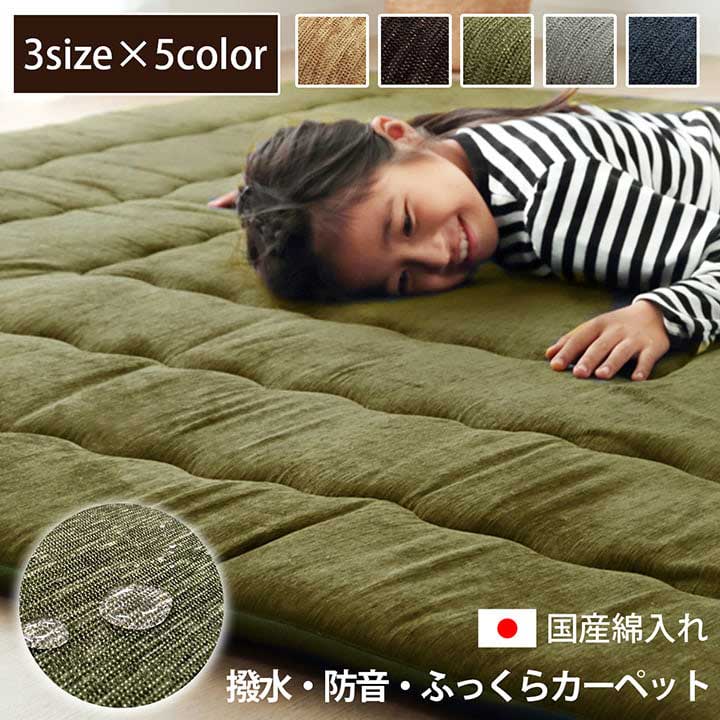 | 厚さ約40mmのボリュームタイプのカーペット。中材にはクッション性にこだわった国産固綿を使用。十分な弾力性があるので底つき感もなくフローリングでのご使用にも最適です。遮音等級はΔLL(I)-9 を取得しており、床下への騒音も軽減します。表地には撥水加工を施しているため、飲み物などをこぼしてもさっと拭き取れて安心です。こたつと併用するとこたつの熱を床下へ逃しにくくなるので省エネ効果もあります。遊び毛がでにくいシェニール糸を使用しているため、お手入れもしやすい。※ 掲載写真は表記サイズと異なる場合がございます。 |