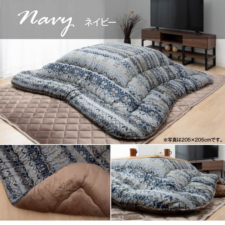 | 落ち着いたデザインと色味で温かみを感じるこたつ布団です。中綿に東レマッシュロン綿を使用、とても軽量な上に、ふんわりと弾力性に富んでいます。表地にはポリエステルピーチスキンを使用しています。裏地は肌触りがなめらかで温かみのあるフランネル素材を使用しています。 |