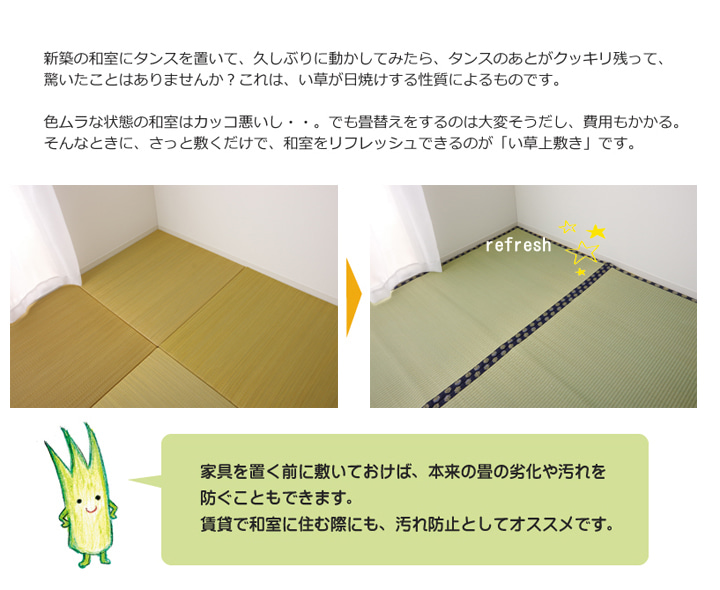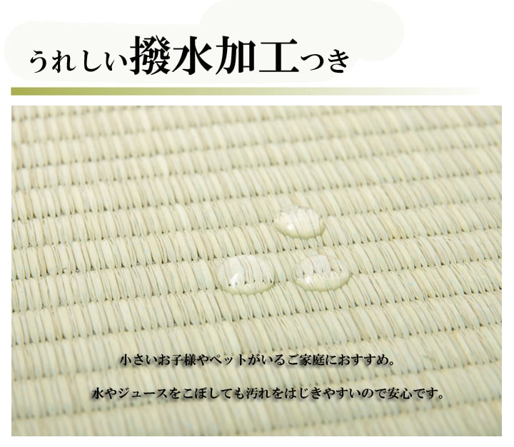 | い草生地の両面に撥水加工を施した(ただし、お湯・お茶・コーヒーなど40℃以上の水分ははじきません)上敷です。上敷きを敷くだけで畳のお部屋をリフレッシュ出来ます。日焼けしてしまった畳のリフレッシュに、新品の畳を汚さない為のカバーにご使用下さい。一般的なイ草上敷はご使用の前に乾拭きが必要ですが、本商品は生地に泥染めをした上から撥水のコーティングをしているため、乾拭きの必要がありません。届いた商品を広げて頂いてそのままご使用頂けます。生地の表裏両面に撥水加工を施しています、両面使用可能で経済的なリバーシブルです。本商品は長さ105~110cm程のイ草を使用しています。そのうち約88cmを使用しています。ヘリ際がある程度白みを帯びます。(日焼けではありません。い草の根元と先端部分の色です。)イ草は長いものほど高級になります。イ草は先端部分が赤茶色く、根元が白く真中が青(緑)色です。真中の良質な青の部分を多く使用するほど、丈夫で綺麗な仕上がりとなります。い草には空気の清浄作用、湿度の調節作用があり、汚れにくいといった特長があります。青森県のヒバの木から抽出した「ヒバエッセンス」をメーカー独自の技術で生地表面に加工しました。ヒバエッセンスにはヒノキチオールという、天然物物質としては極めて抗菌性の高い成分が含まれています。(無加工品に比べ抗菌、防臭効果があります。)※自然素材であること、また職人が一つ一つ手作業にて加工を行うため、形状のバラツキや表示サイズと多少異なることがあります。※撥水加工の工程上、イ草生地が若干赤みを帯びております。予めご了承頂きますようお願いします。 |
