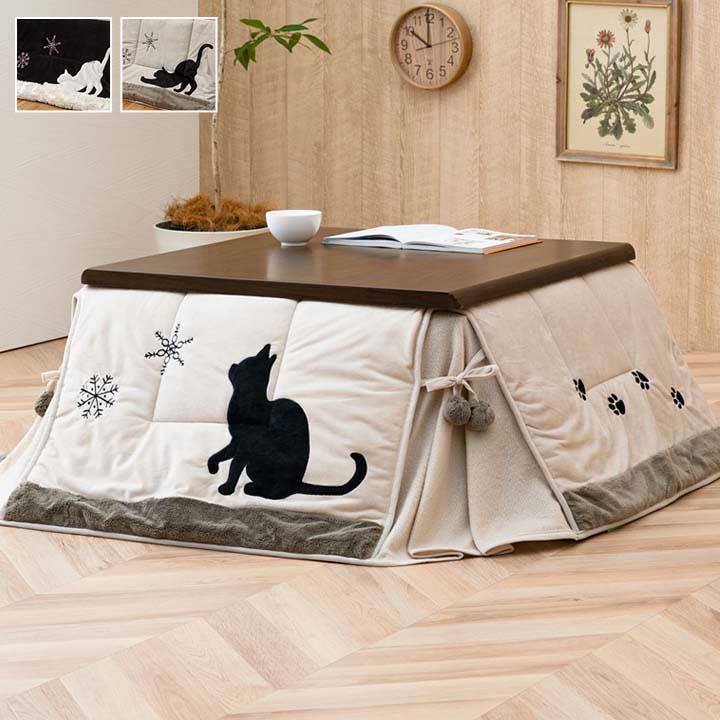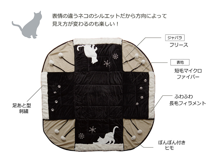 | 人気のネコ柄のコタツ布団です。ネコの柄をシルエット調にし、雪の結晶はプリントではなく、刺繍で表現することで、甘くなりすぎず、シックな雰囲気に仕上げました。表地には耐久性に優れ、しっとりとやわらかな短毛のマイクロファイバー生地を使用しています。裏地には軽くて保温性の高いフリースを使用しています。省スペースタイプで角が膨らまず、お部屋を広く使えます。薄手なので折りたたんでもかさばらず、コンパクトに収納できます。部分暖房のコタツは電気代もおトクです。 |