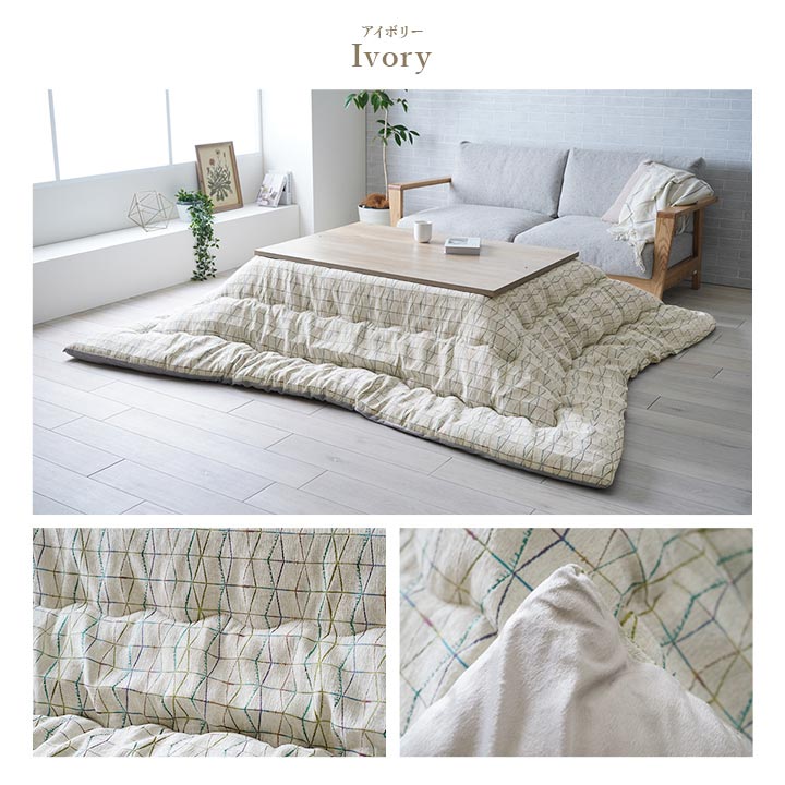 | 多色の色糸を使い、シンプルながらひと手間加えたデザインのこたつ布団です。表地にはシェニール糸を使用した生地を使用しています。裏地には肌触りが良いマイクロファイバーを使用しています。中綿には弾力性と保温性の高い東レマッシュロン綿を使用しているため軽くて暖かいです。部分暖房のこたつは電気代もおトクです。 |