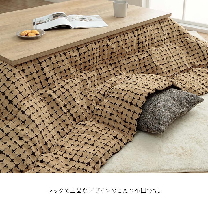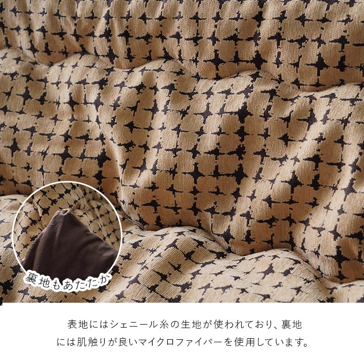 | シックで上品なデザインのこたつ布団です。表地にはシェニール糸を使用した生地を使用しています。裏地には肌触りが良いマイクロファイバーを使用しています。中綿には弾力性と保温性の高い東レマッシュロン綿を使用しているため軽くて暖かいです。部分暖房のこたつは電気代もおトクです。 |