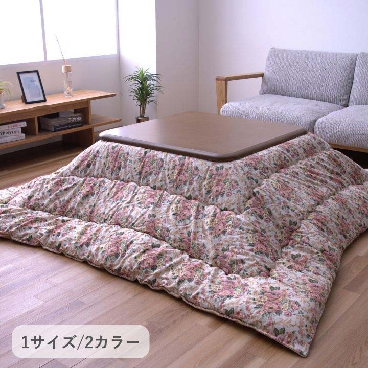 | 花柄のオシャレなデザインのこたつ布団。裏面は肌触りが気持ちいい素材を使用しています。保温性がある中綿を使用しているので、暖かいです。 |