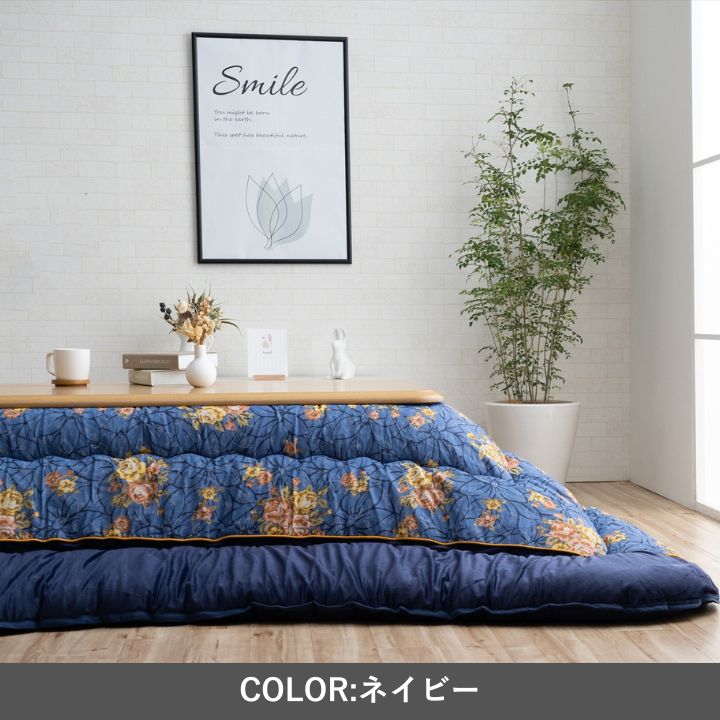 | 花柄が映える、落ち着きのあるデザインのこたつ布団。※掛布団のみの販売ページです。保温性がある中綿を使用しているので、暖かいです。 |