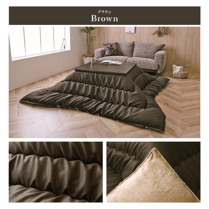 | 国産プリントでやさしいレザー調の生地を使用したこたつ布団。洋室にも合わせやすいシンプルなデザイン。ふっくらとしたボリューム感は国内で綿入加工をしている商品だからできる仕上がりです。裏地にはあったか素材のフランネルを使用しています。※こたつ台、敷布団は別売りです。※ふとんをやぐらの中に押し込んだり、座イスやイス全体をこたつの中に入れたまま使用しないでください。ふとんがヒーターに当たらないようにご使用ください。(火災の原因になります)ご使用により、ふとんが焦げた場合につきましては、返品・交換を承ることができませんので、あらかじめご了承ください。※掲載写真は表記サイズと異なる場合がございます。 |