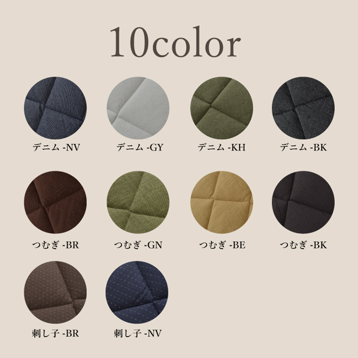 | 素材:表地=綿100%裏地=ポリプロピレン不織布100%(ドット滑り止め加工)中材=(上層)中空ポリエステル綿100% (下層)ウレタンフォーム10mm |