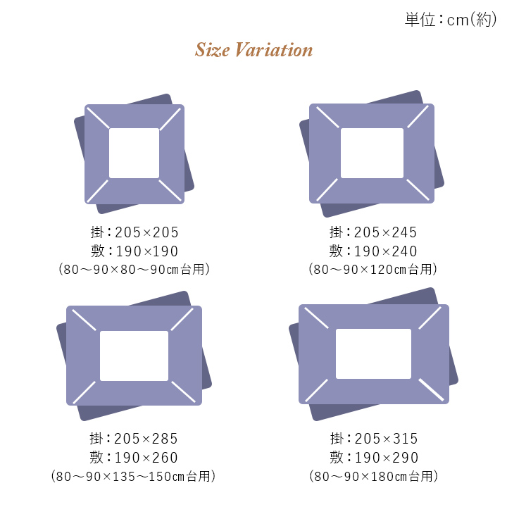 | 華やかな雰囲気を演出してくれるエレガンス柄のこたつ布団。こたつ布団と敷布団の2点セットで統一感のあるお部屋に!ふっくらとしたボリューム感は国内で綿入加工をしている商品だからできる仕上がりです。裏地にはあったか素材のフランネルを使用しています。※こたつ台は別売りです。※ふとんをやぐらの中に押し込んだり、座イスやイス全体をこたつの中に入れたまま使用しないでください。ふとんがヒーターに当たらないようにご使用ください。(火災の原因になります)ご使用により、ふとんが焦げた場合につきましては、返品・交換を承ることができませんので、あらかじめご了承ください。※掲載写真は表記サイズと異なる場合がございます。 |