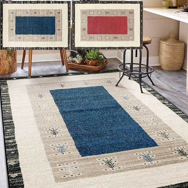 遊牧民が織る素朴な雰囲気をモダンにアレンジしたデザインが特徴です。全体的な印象としてはシンプル、中央に配されたアクセントカラーがポイントになり、インテリアを引き締めてくれます。